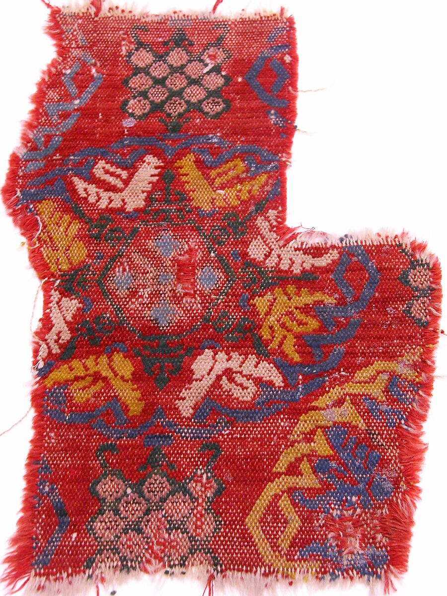 The main decorative element of this wool fragment depicts a blue medallion, containing abstracted yellow and white birds flanking a plant or tree. Other areas of the fragment are ornamented with interlaceing pattern in a rainbow of colors.