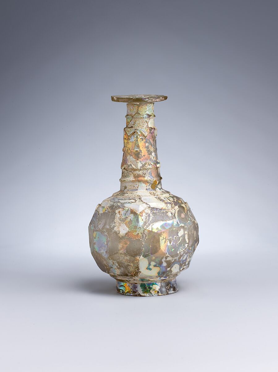 The main decoration of this iridescent glass bottle is made of horizontal rows of hexagons, in a "honeycomb" pattern. This faceted effect was created by slicing off portions of the surface from the original spherical shape. This pattern was well known in Iran and Mesopotamia in the Sasanian era and was revived by the glass-cutters of the early Islamic period.