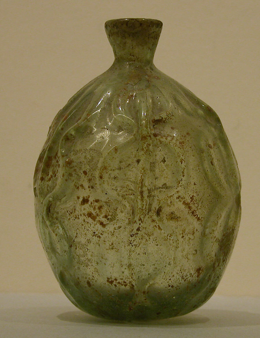 The decoration on this bottle resembles a popular design on late Roman imperial glass vessels. The technique, however, is different: the glass was blown into a vertically ribbed mold, then the ribs created on its surface were pinched together and the vessel was blown again to its present size.