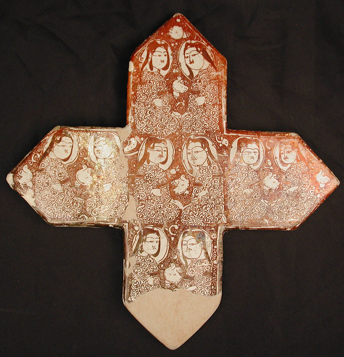 This cross-shaped tile is a rare example decorated with human figures. The confronted and seated figures have haloes around their heads, following the seljuq convention, and their garments are covered with a series of interlocked semicircles ending in dots.