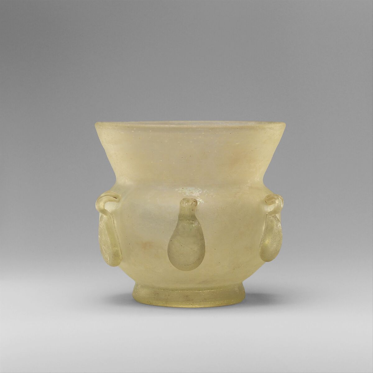 The squat body, short flared neck, and low foot of this object are typical of lamps produced before the thirteenth century. The characteristic suspension rings around the bodies of these lamps are another prominent feature. This example probably once had a vertical glass tube attached to its base to float a wick in oil.