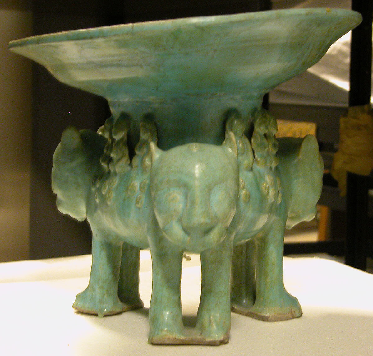 This object is an unusual combination of decorative ceramic sculpture and a utilitarian dish. Such a juxtaposition was employed in later stone sculpture, particularly for fountains.