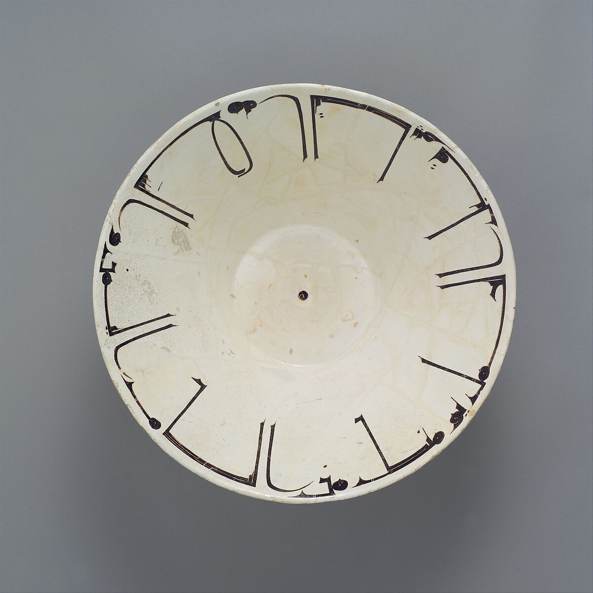 The calligraphic decoration on this bowl reads "Planning before work protects you from regret; prosperity and peace," but the shortening, bending, and elongation of the letters has transformed the words into abstract motifs of tremendous power. With its monumental presence and the artful arrangement of its letters, in which vertical flourishes punctuate the horizontal flow of the words at rhythmic intervals, this bowl stands out among the many other inscribed ceramics of the same period.