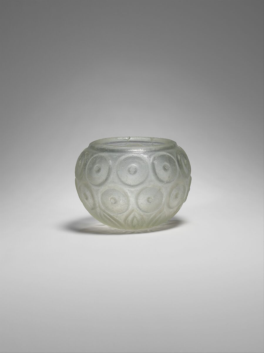 Disks with raised dots at the center encircle the body of this small spherical cup. Echoing the omphalos (navel‑shaped) motif found on objects from ninth‑century Samarra, designs such as the one seen here are inspired by Sasanian cut glass. The maker achieved a harmonious surface treatment by cutting away the surrounding glass, leaving the circles in relief. Petals radiating from the circular base decorate the lower part of the cup.