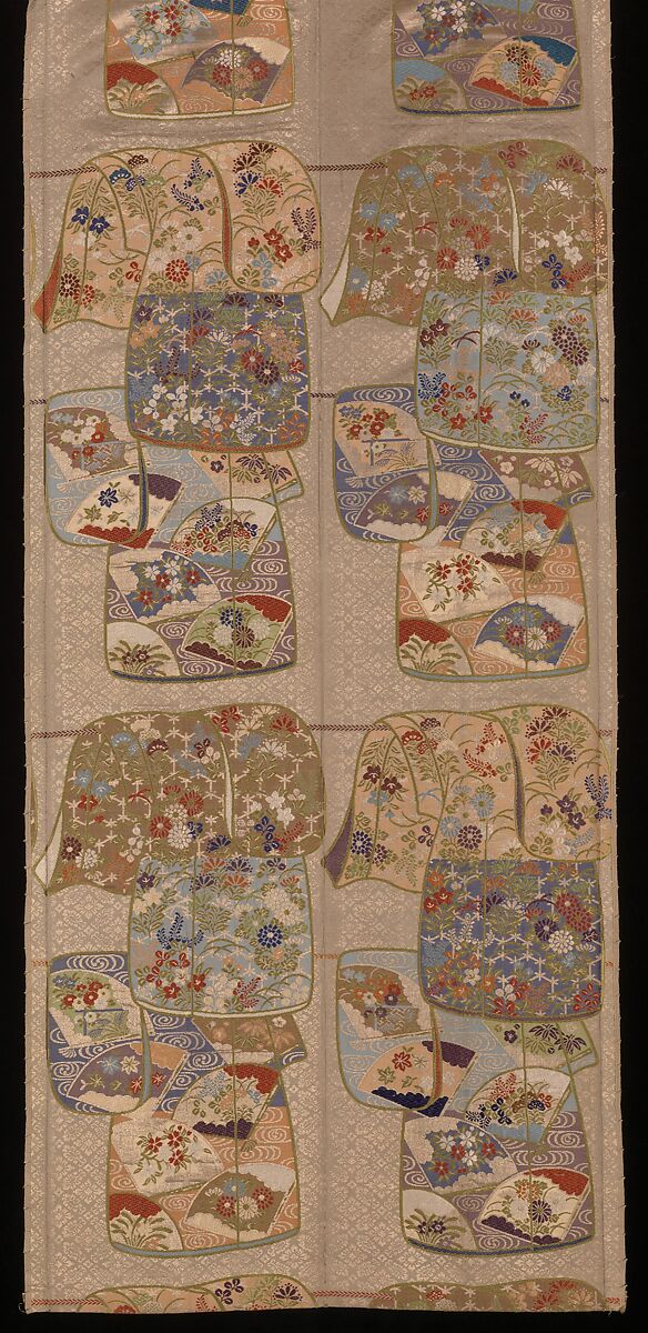 A masterpiece of complex brocade weaving, this brightly colored obi, or sash, has a repeat pattern of kosode hung from silken cords. It evokes the traditional Tagasode (or "whose sleeves?") screen paintings of the Momoyama period (1568–1615), intended to pique interest in the woman who wore such evocative robes.