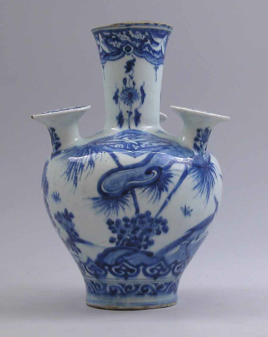 This multispouted vessel is often referred to as a tulip vase. Although its exact purpose in the Safavid milieu is unknown, it could have functioned as a container for holding tulip bulbs. As large quantities of Chinese blue-and- white porcelain vases in a myriad of shapes were imported to Iran and Europe in the seventeenth century, it is possible that they inspired locally produced variations.