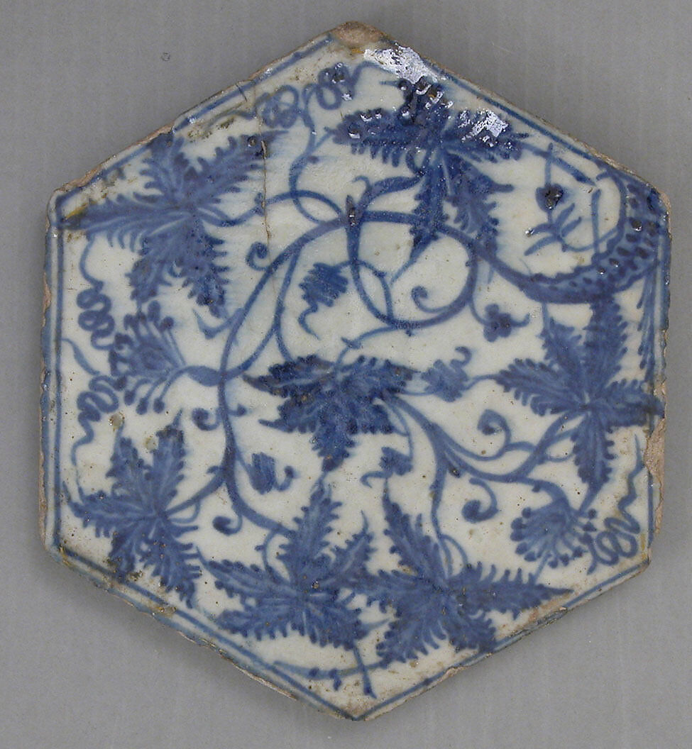 The design of this tile was strongly influenced by Chinese models, in both composition and color. The Egyptian taste for blue-and-white botanical designs was filtered through Iranian versions from the Ilkhanid period (1256–1353). It is known that Iranian artists moved westward at the beginning of the fifteenth century.