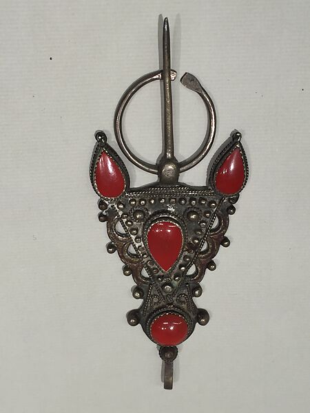 Perhaps the best-known form of North African Berber jewelry is the triangular-shaped fibula. Such pins were worn at the shoulder to fasten cloth garments. While coral was a much valued gemstone in Berber culture, plastic imitation is often found as an affordable substitute in jewelry from the twentieth century.