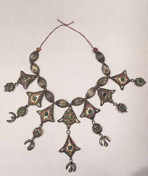 This lebba, or wedding necklace worn by a bride, is made up of the traditional number of seven pendants of multiple shapes. The crescent-and-moon motif may allude to an eyebrow and an iris, a talismanic form that protects the wearer from the evil eye. The triangular motif is known as gharnati ("from Granada"), indicating the history of Andalusian craftsmen in Morocco. The ten elongated and ribbed beads separating the pendants are known as kraqueb.
