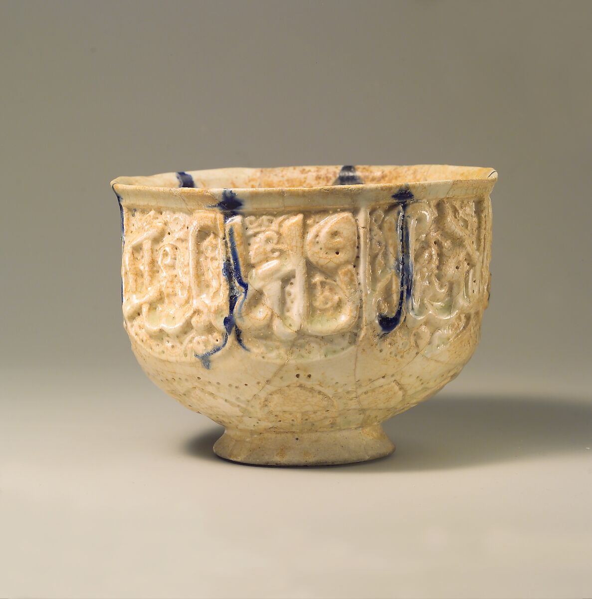 The auspicious words “glory, prosperity, blessed power, and mercy to its owner” are inscribed in cursive script on this bowl, while the kufic inscription reads “Made by Hasan al-Qashani.” The latter portion of the potter’s name links him to Kashan, a central Iranian town that was a major center for stonepaste production and is believed to have had a monopoly on complex ceramic technologies. Stonepaste, however, was produced throughout Iran.