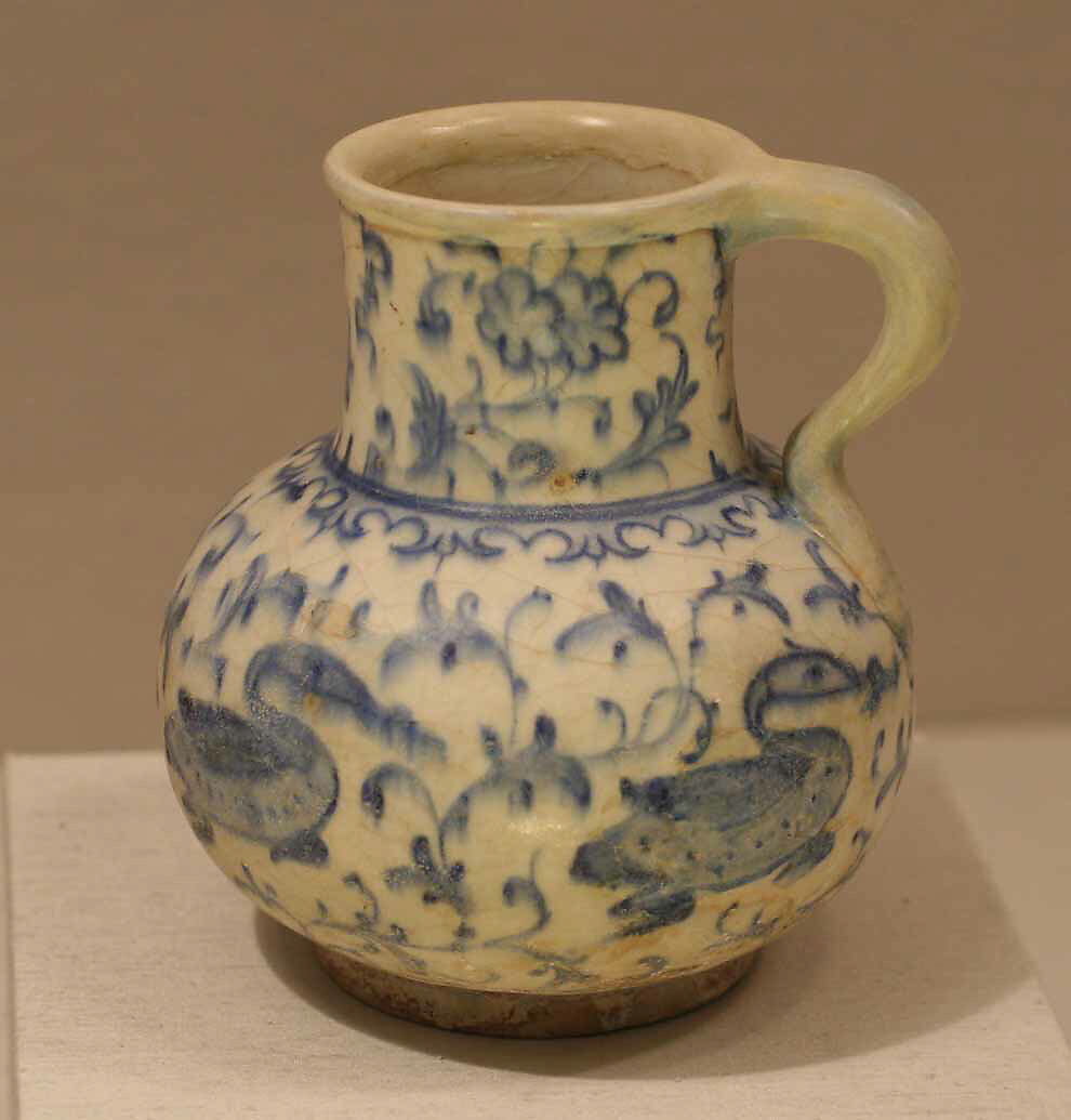 The pot-bellied form of this stonepaste ewer originated in Central Asia and spread to Ming China during the Timurid period. Made of metal, jade, or stonepaste, these objects incorporated elements borrowed from Chinese art, including, in this example, the blue-and-white color scheme and the decoration of long-necked ducks. Many of these ewers were also given dragon-shaped handles.