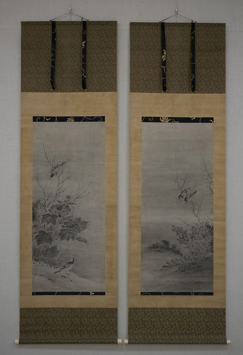 The lively depiction of birds in natural settings with seasonal trees and flowers was a favorite theme in early ink painting and a hallmark of the Kano school of painters led by Kano Motonobu (ca. 1476–1559). This rendition attributed to Motonobu's brother, Yukinobu, is in the ink-wash style inspired by the Southern Song painter Muqi (late 13th–early 14th century), which uses tonal variations of ink instead of outlines to define the soft forms of feathers and flowers.