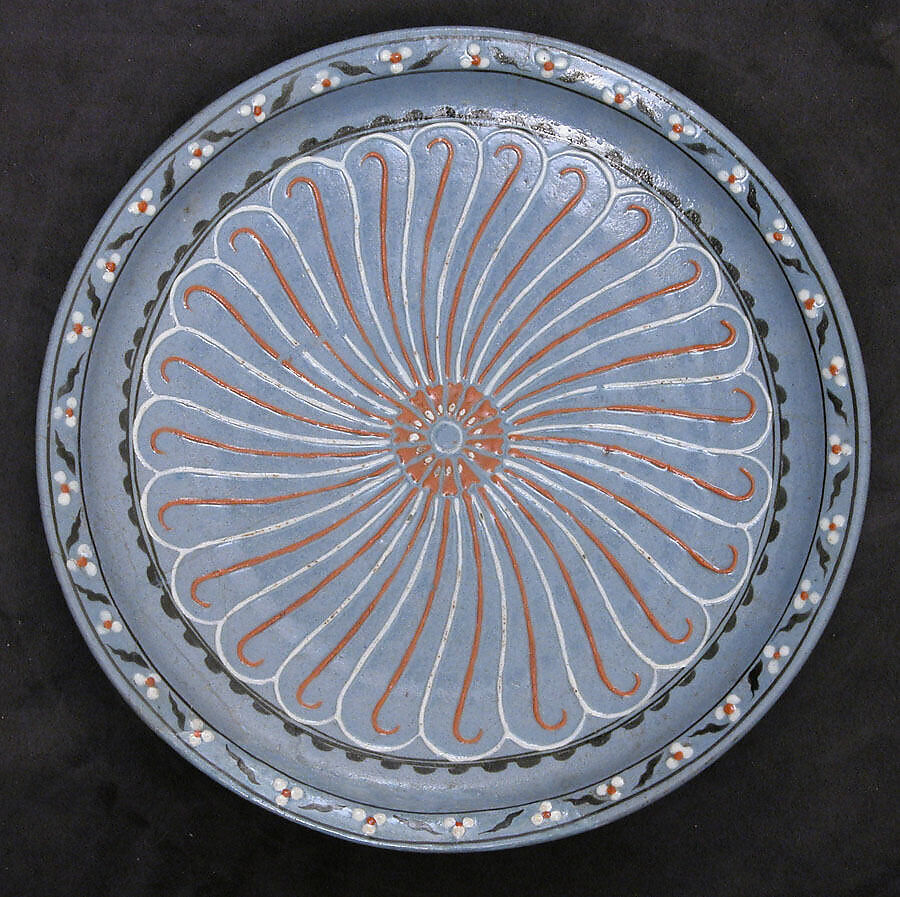 Most Iznik wares were coated with a white slip, or engobe, prior to decoration, and this slip produced the predominant white background against which colored glazes stood out so dramatically. In a small number of wares, pigments were added to the slip, and the resulting backgrounds included a range of pinks, beiges, browns, and blues that were decorated with floral designs or, in this case, an abstract pattern of petals or swirling lobes, perhaps inspired by a metalwork prototype.