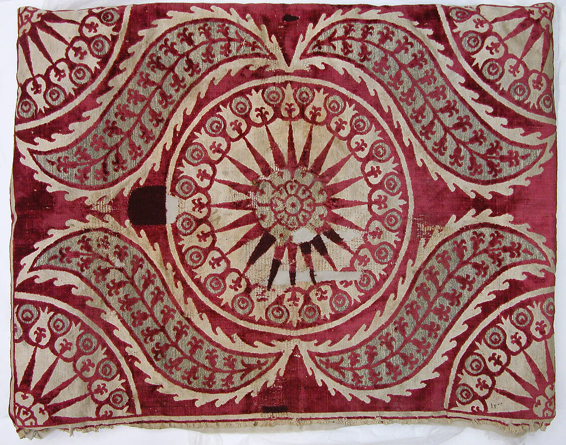 - Medium: Silk, cotton, and metal wrapped thread; cut and voided velvet, brocaded.