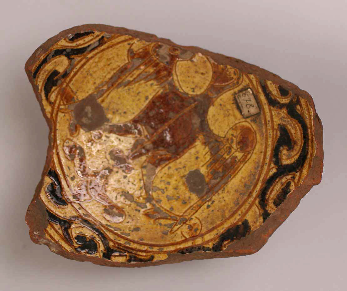- Medium: Earthenware; incised decoration through white slip and coloring under transparent glaze