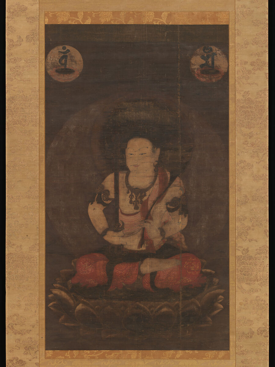 This variant form of the bodhisattva Monju, a deity associated with wisdom, is called Monju with Five Topknots (Gokei Monju). Imagined as a boy sitting cross-legged on a lotus pedestal, he holds his usual attributes: a sword and sacred text. A pair of Sanskrit letters above him stands for Dainichi, the buddha at the center of the Buddhist cosmos.
