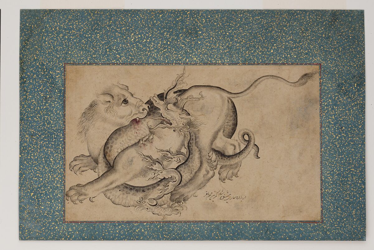 While the subject of dragons in combat with real or imaginary animals has a long history in Persian painting, originating with the Mongols in the thirteenth century, the more immediate inspiration for this composition is most likely in the work of the seventeenth-century Safavid artist Mu'in Musavvir. His numerous drawings of lions depict the beasts with large, expressive eyes similar to those of Muhammad Baqir's creature. What differentiates the eighteenth-century drawing from its Safavid forebears is the use of ink wash, a technique borrowed from European sources, to define the musculature of both lion and dragon. Finally, the iconography of this drawing is novel since customarily both dragons and lions are shown defeating a weaker foe. Here, the two are face to face, with the lion drawing first blood but the outcome of their struggle forever uncertain.