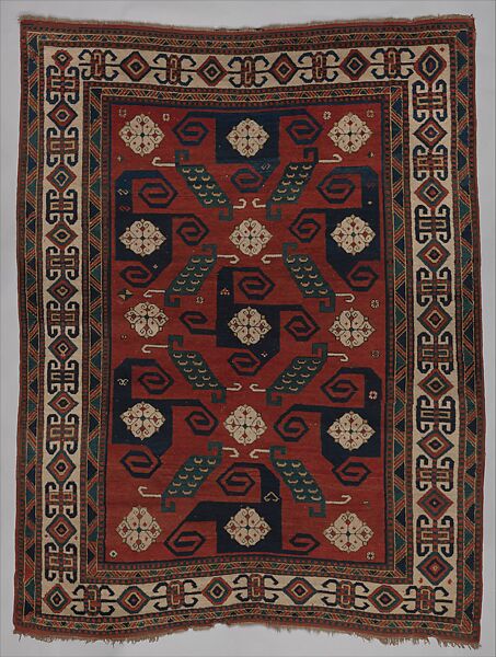 Kazaks are typified by large, bold patterning, vibrant colors and frequently, high pile. Here, a most unusual design of hooked swastika forms in alternating staggered rows appears on the familiar red-colored ground. Green lozenge shapes, possibly stylized leaves, form a trellis pattern creating a sense of rhythm and movement.