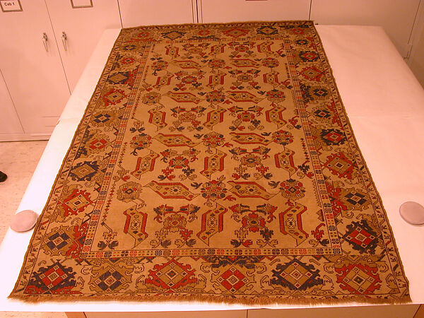 - Medium: Wool (warp, weft, and pile); symmetrically knotted pile