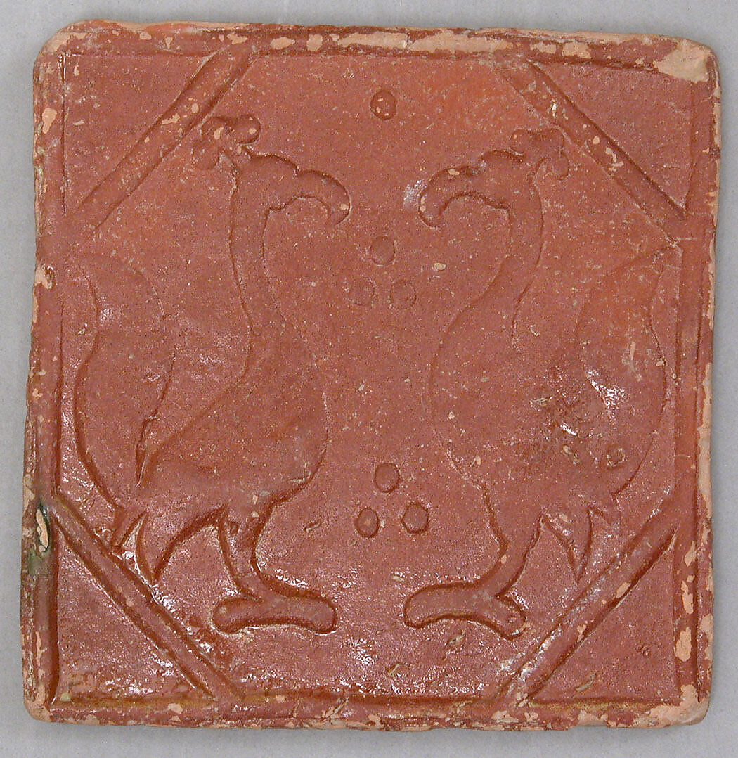 This tile belongs to a unique group of monochrome glazed, molded relief tiles excavated from a palace at Ghazni, in modern Afghanistan. The decoration on this group consists of animals in heraldic poses (as seen here), as well as vegetal scrolls and calligraphy, often surrounded by beaded borders. The excavation stratigraphy dates them to the early thirteenth century, the period of the city’s Ghurid rule. They were probably manufactured in Ghazni especially for the palace.