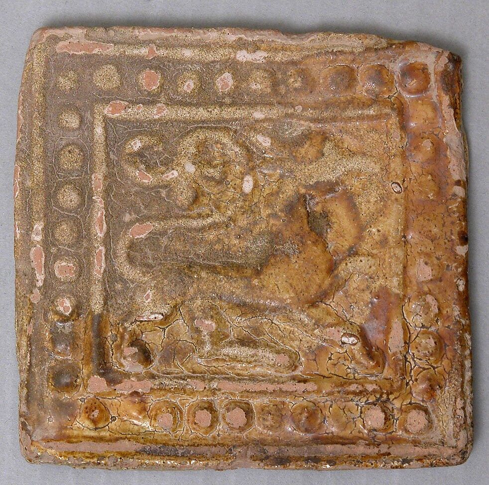 This tile belongs to a series found in Ghazni, the capital of the Ghaznavid dynasty (977–1186), in a house destroyed during the Mongol invasion of 1221. Most of the tiles in the series are square, some are polygonal, and are molded in relief with animals, plants, or occasionally inscriptions. Even though these tiles are unique in style, their decoration shows affinities with classical pre-Islamic motifs from Iran, such as the "pearl" borders and the animals in profile within a frame.