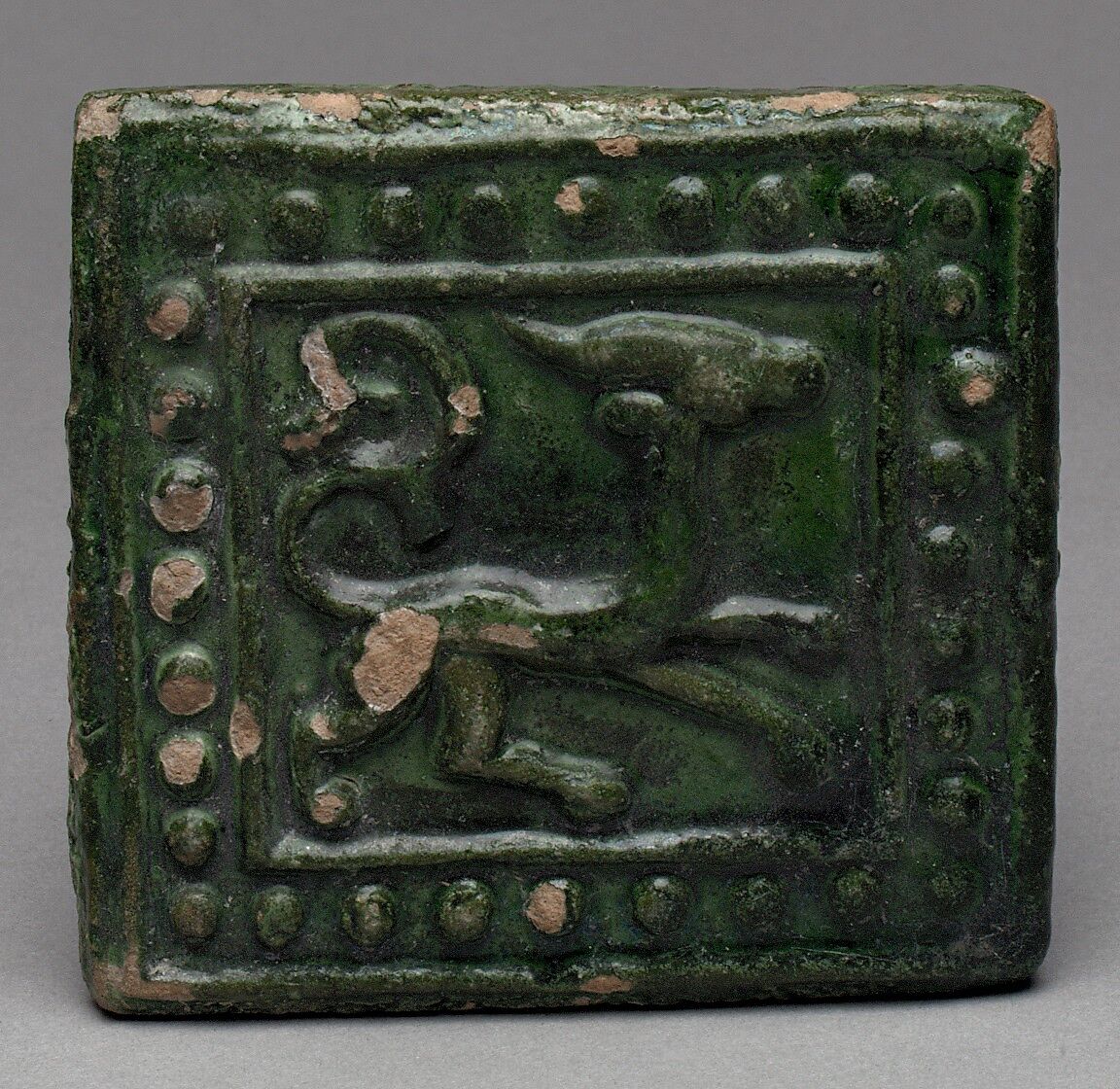 This tile belongs to a series found in Ghazni, the capital of the Ghaznavid dynasty (977–1186), in a house destroyed during the Mongol invasion of 1221. Most of the tiles in the series are square, some are polygonal, and are molded in relief with animals, plants, or occasionally inscriptions. Even though these tiles are unique in style, their decoration shows affinities with classical pre-Islamic motifs from Iran, such as the "pearl" borders and the animals in profile within a frame.