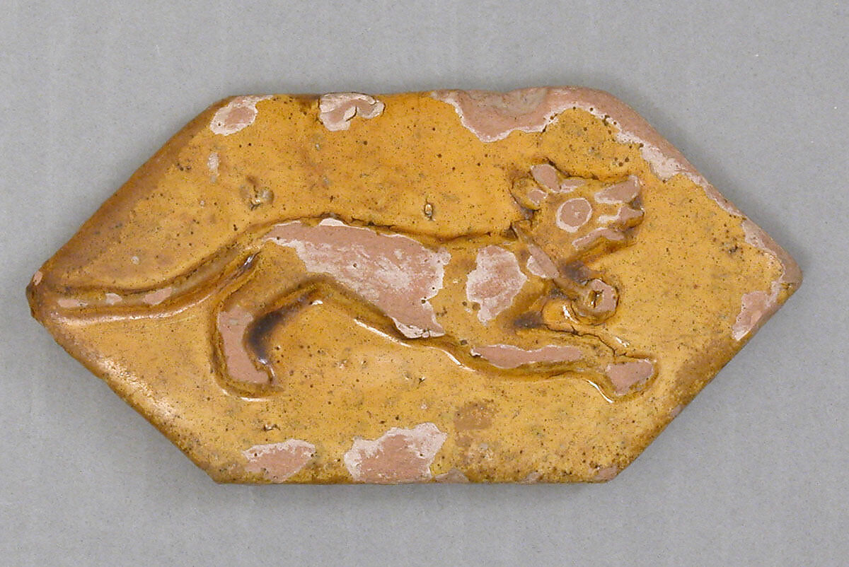 This tile belongs to a series found in Ghazni, the capital of the Ghaznavid dynasty ( 977–1187), in a house destroyed during the Mongol invasion of 1221. Most of the tiles in the series are square, though some are polygonal, and are molded in relief with animals, plants, or, occasionally, inscriptions. Even though these tiles are unique in style, their decoration shows affinities with pre-Islamic motifs from Susa, such as the "pearl" borders and the animals in profile within a frame.