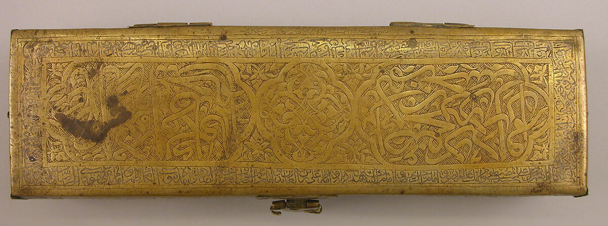 This pen box is decorated with bold thuluth calligraphic inscriptions and interlaced floral arabesques. The particular floral ornament, as well as the epigraphic style, is typical of Iranian metalwork dating to the late 15th and early 16th century.