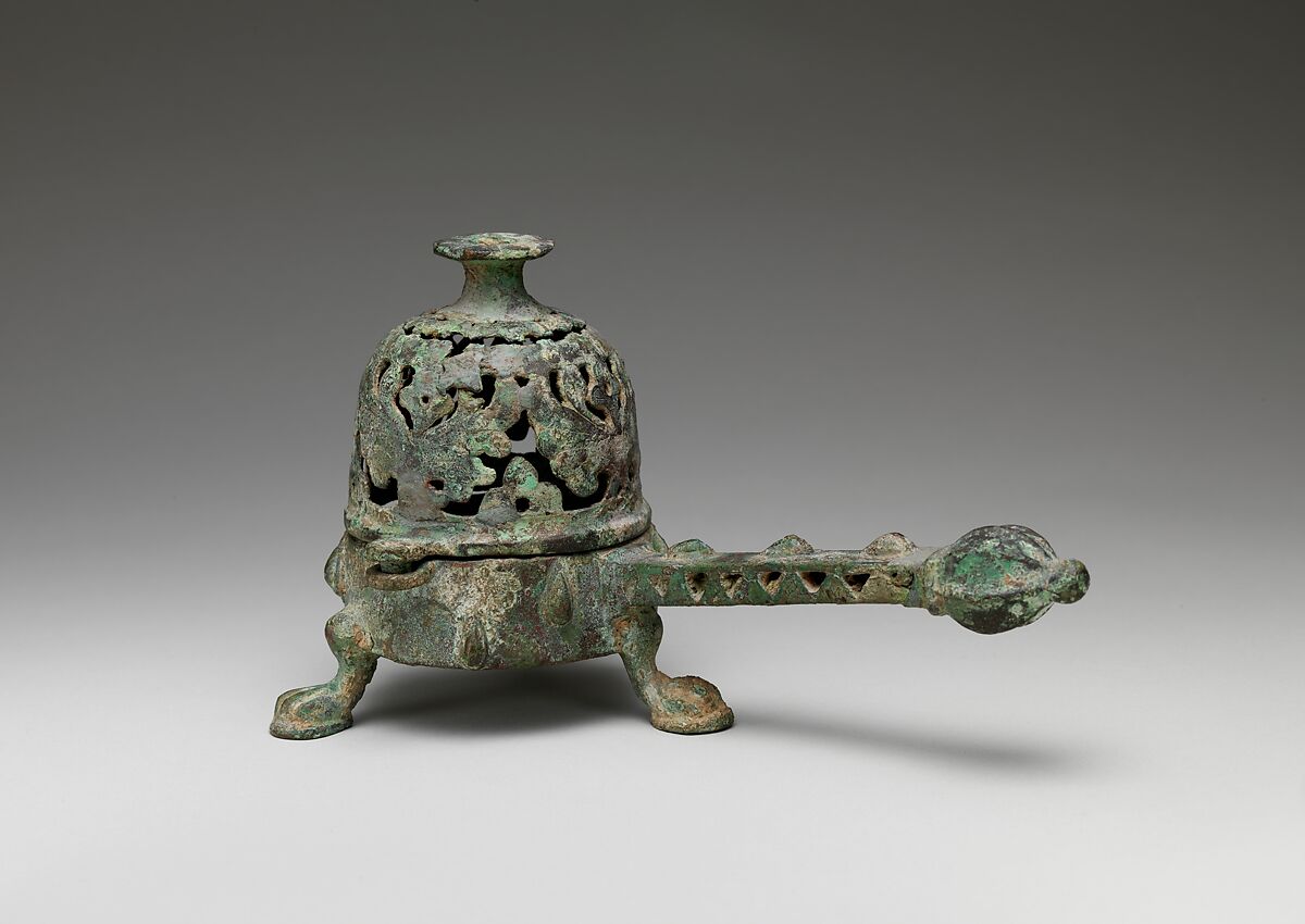 Incense burners like this one were popularly used in the late antique and Byzantine eastern Mediterranean, and their production continued into the Islamic period. In Christian contexts, incense was used in church services, while in the Islamic world it seems to have been used by caliphs in their palaces and by elites in their homes. This three-legged incense burner with a low cylindrical body and a hinged, relatively high domed cover was a common type. The cover, pierced to emit smoke, is decorated with wings and vegetal designs; the legs are shaped like feline paws.