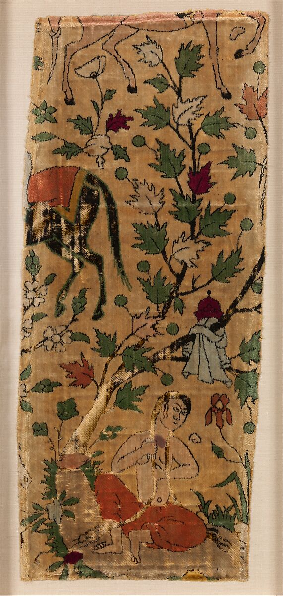 This delicately woven silk velvet depicts the love story "Khusrau and Shirin" by the Persian poet Nizami (d. 1209). The Sasanian king Khusrau has become smitten with the Armenian princess Shirin based on a portrait delivered to him at court. Impatient to see his future bride in person, he ventures from Iran to Armenia as she is simultaneously being brought to him, and the two unexpectedly cross paths while Shirin is bathing in a stream. Larger fragments of the same velvet retaining the full design repeat show Khusrau, in full Safavid courtier dress, seated on horseback looking on at Shirin in wonder. Except for a red cloth around her waist, Shirin's clothes hang from a nearby tree. The black silk used in the areas of Shirin's hair and the tree branches has oxidized, and only the foundation fabric remains.
