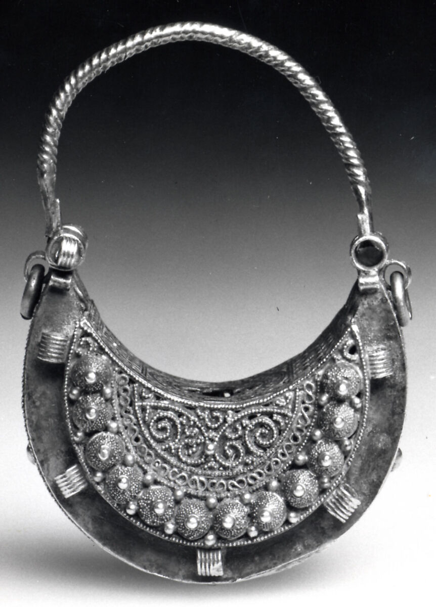 This crescent-shaped (hilal) earring has been fabricated with filigree, beaded granulation, and several loops around the perimeter and interior which once attached gems. These characteristics, along with the hemispherical ornament, are typical of the opulent jewelry from the Fatimid Period (909–1171). The Fatimids ruled a kingdom that stretched across North Africa, the Levant and Hijaz, and as far south as Nubia, modern day Sudan, where it maintained control over the important gold mines which provided the raw materials required to make these sumptuous jewels. This earring is made from electrum, a natural alloy of gold and silver.