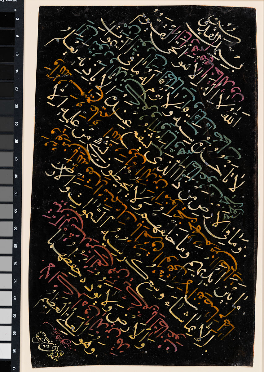 Muhammad Shafi' (1779–1846), known as Vesal of Shiraz, is among the most celebrated and prolific calligraphers and poets of the Qajar period. He descended from a line of scribes who served at the local courts of the Safavid, Afshar, and Zand rulers. He was proficient in seven scripts, particularly in naskhi and nasta'liq. He is known to have copied over sixty Qur'ans in his lifetime, as well as manuscripts of other texts, and single and mashq pages. He specialized in revival naskhi in the style of late Safavid calligraphers, particularly Ibrahim Qumi and Ahmad Nairizi, considered the uncontested master of revival naskhi in Iran. This page contains excerpts from a Qur'an written in fine naskhi. There are eight diagonal lines of text in cream-colored ink between which an additional eight lines are written in reverse, in pink, yellow, and blue inks. The forward facing lines comprise the throne verse from the Qur'an (Sura 2, verse 255), and the colored letters are a continuation of the text through the next two verses. This work illustrates the Qajar calligrapher's preference for writing in an unprecedented range of colored inks on backgrounds of unusual color. It also reflects the penchant for writing in a multidirectional manner, whereby the reader is forced to turn the page around in order to read the text.