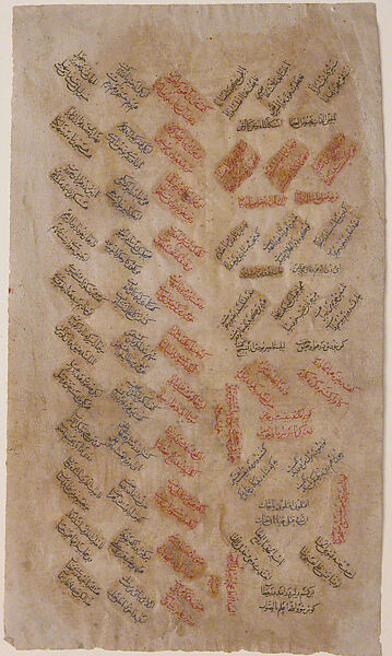 This composition consists of pairs of short diagonal lines of text forming a chevron pattern in black, red and blue ink. The contents include verses from Rumi’s Mathnavi and invocations to ʿAli (the first Shi’ite Imam). According to an inscription, the folio was intended as a presentation piece from the calligrapher to a "real friend." Written in ghubar (dust-like script), the page is by Muhammad Isma’il known as Tawhid, the fifth son of the renowned calligrapher and poet Muhammad Shafiʿ Vesal (see 1979.518.6). He was reportedly a jewelry designer and a poet and had the unique ability to copy Qur’anic and literary verses in minute proportions.