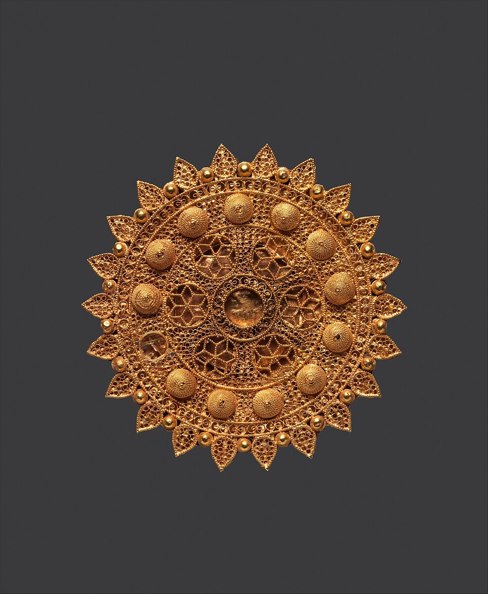 This splendid gold roundel exemplifies the refinement of Seljuq goldsmithing by virtue of its construction and combination of techniques. The filigree on the surface is laid on a ground of thin, gold strips arranged in concentric circles, a technique influenced by contemporaneous jewelry from Syria and the Fatimid dynasty in Egypt. The object resembles a sunburst, and its central element, now lost, might have been a gem or gold dome surrounded by six stars, symbolizing the planets. It could have been sewn onto a man’s headdress, as seen in images of Seljuq grandees.