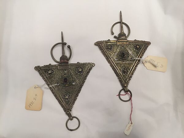 Fibulae, such as this triangular shaped one, were used to affix an Amazigh (Berber) woman’s garment at the shoulder. This ornament consists of many small rings of silver, resembling a worm-eaten piece of wood, and for that reason fibulae of this style are known as tizerzaï n taouka, or fibulae of the worm. The central rosette on this object bears traces of yellow and green enamel, a decorative technique that was believed to have arrived in Morocco from Spain.