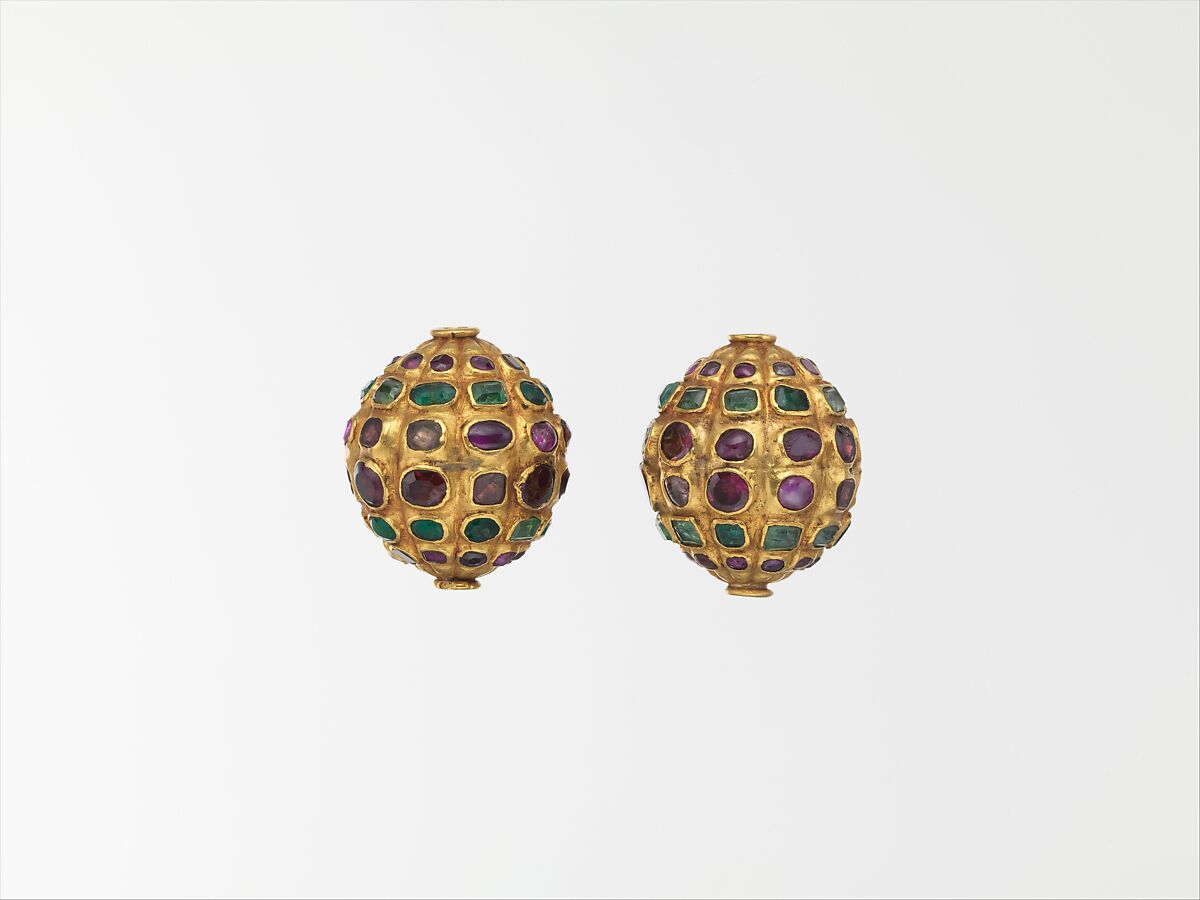 Because this bead and 1981.5.19 are the only beads of their type known to us, we can only speculate as to how they were used in combination with other elements; it is likely, however, that they were strung as a necklace and separated by pearls in multiple strands, as was common in many seventeenth- to nineteenth-century Moroccan necklaces. Although this type of pushed-up setting on a repoussé ground of thin metal is typical of Moroccan jewelry, the fine workmanship and design, including the dense setting of stones in graduated rows on the melonlike form, create an effect unparalleled in the work of this school.