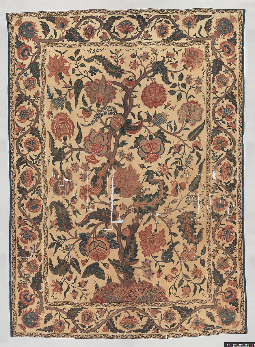 This type of dyed cloth, known as a palampore from the Hindi term for a bed cover, palangposh, was made in abundance in India for the European market in the late seventeenth and eighteenth centuries. The size of the palampores conformed to bed sizes in Europe, and their decoration, often with a central tree laden with fruits and birds, combined elements from English embroideries, Chinese decorative objects, and Indian textiles. Lengths of such fabric also hung on the walls of the bedrooms, which were often decorated with Chinese porcelains and other Eastern exotica.