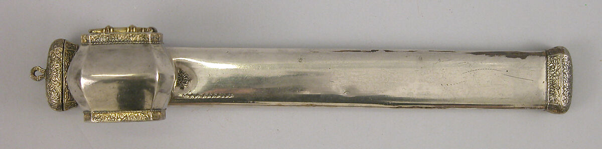 This portable pen case, or divit, has an inkwell on the exterior, at one end of the tubular arm that holds the pens. This example is characteristically Ottoman in its silver body and gold overlay with a tughra stamp of the imperial mint.