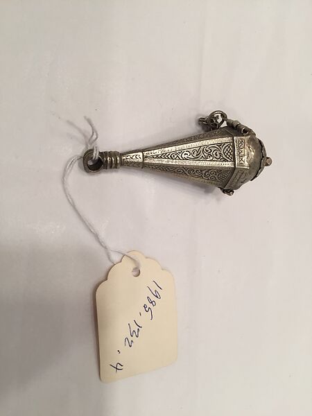 Amazigh (Berber) jewels oftentimes created an overall effect of multisensory pleasure and opulence. In addition to being a beautifully crafted piece of metalwork, this object also facilitated a delightful olfactory function. A small hinge opens the top dome on this object which would have allowed for the placement of incense or other perfumed materials inside, contributing to a fragrant as well as visually stunning presence.