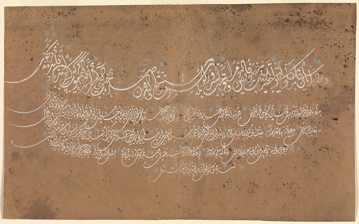 The striking beauty of this page, with the swooping curves and loops of the letters in white ink enhanced with blue dots against rich brown paper, entrances the eye to the extent that the content, which is difficult to decipher, seems irrelevant. The somewhat enlarged first line acknowledges benefits and kindnesses received from someone, while the next three lines contain expressions of gratitude and good wishes. The last line consists of the signature and date. The styles of calligraphy used in chancelleries developed differently from those used in Qur'ans or literary texts and culminated in the Ottoman divani script (from diwan, the "secretariat" or "assembly of officials"). Calligraphers excelling in this script were members of an elite cadre within the Ottoman bureaucracy.