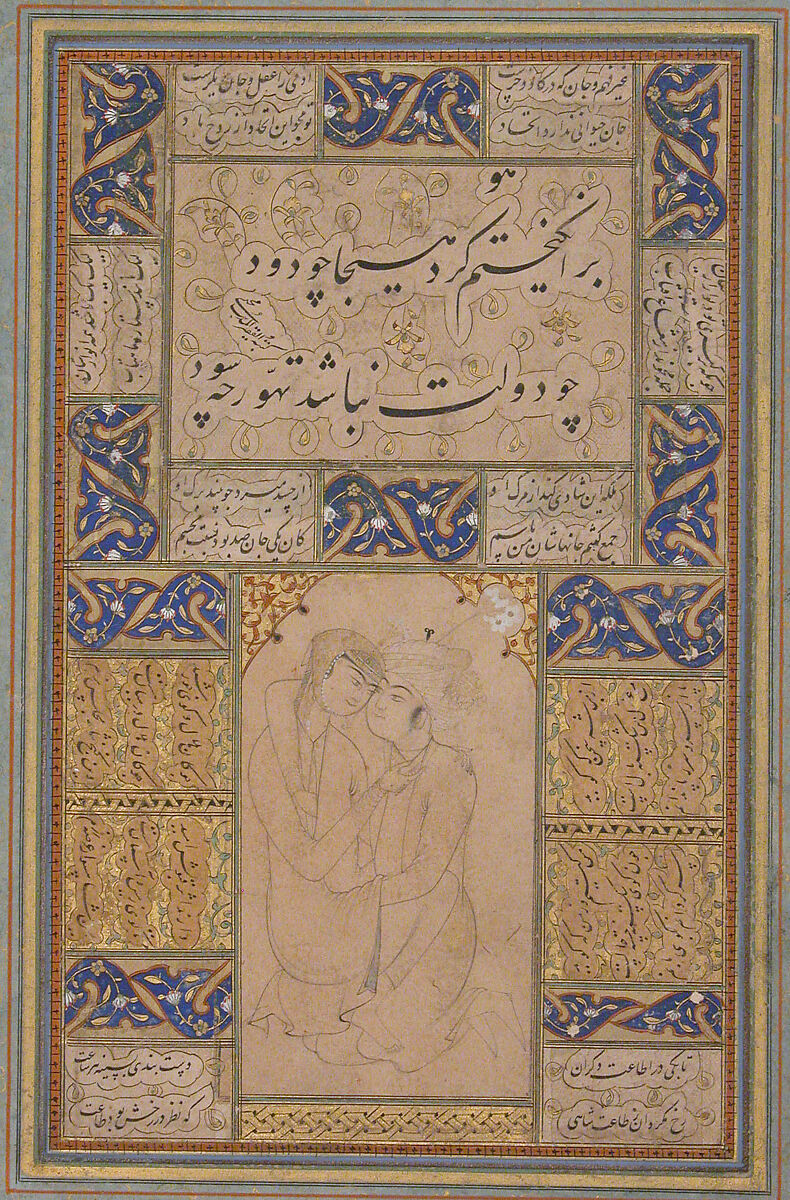 This album page consists of cut‑out panels of calligraphy in nasta'liq script alternating with panels of illumination, all surrounding a drawing of an amorous couple. The delicacy with which the lovers are rendered makes for an unusually sensual image. The drawing is surrounded by lyrical and mystical verses, integrating the page into a cohesive whole.