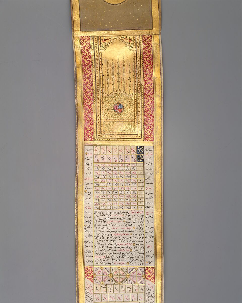 This small illuminated handscroll once functioned as a portable calendar-almanac, or ruznama. Its diverse contents include texts describing the stations of the sun and moon, the musical modes, the Muslim calendar, the times of prayer in different seasons, the Christian calendar, and the times of sunrise and sunset—all arranged according to the position of Istanbul, where its owner is assumed to have lived.