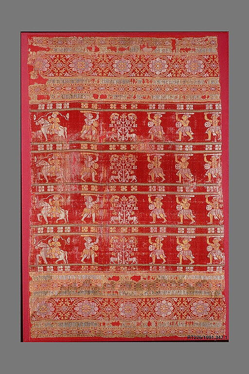 A substantial body of textiles, of which some have only recently come to light, can be tentatively assigned to one of the imperial workshops established by the Mughal emperor Akbar (r. 1550–1605) during the late sixteenth century. Although similar in material, color, and structure, these textiles have highly varied patterns. This example has friezes of striding Rajput warriors and riders framed above and below by joined borders featuring lotus medallions.