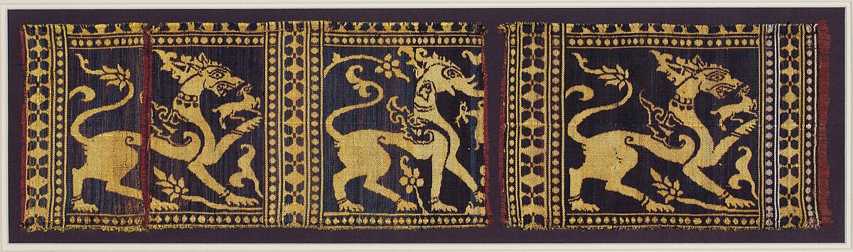 This silk textile composed of fifteen fragments, including two in a private collection, depicts three forms of the vyala, a mythological creature whose leonine body is combined with parts of other animals. This form had its origins in traditional Indian art, where it was used in architectural settings as a symbolic guard for Hindu temples. Here, all three vyalas are winged, and the central form has the head of an elephant.