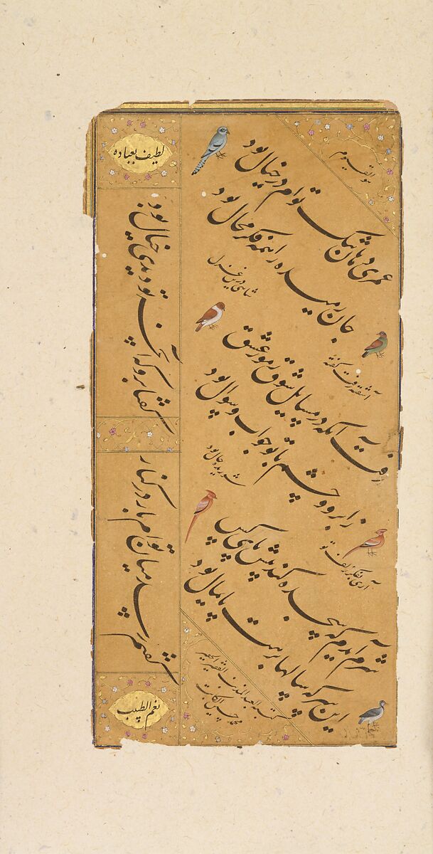 Muhammad Husain al-Katib (Zarrin Qalam), one of the most celebrated calligraphers of Emperor Akbar’s time, signed this folio in the lower triangle. Written in nastaʻliq, which was Akbar’s preferred script, the poetic verses run diagonally across the page with birds marking the beginnings and ends of many couplets. The poetry is by Amir Shahi, a Persian poet of the Timurid period.