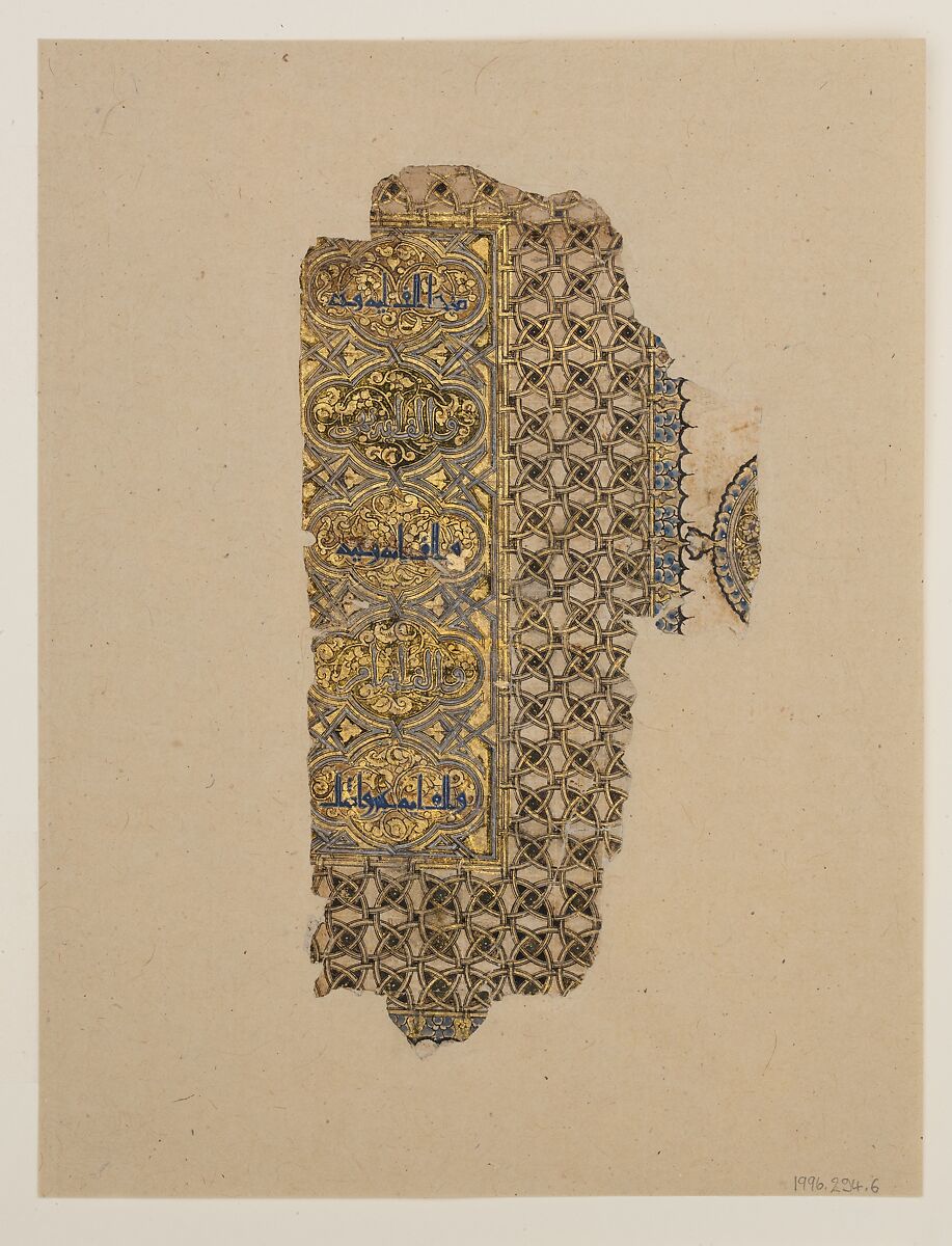 Eight folios of this dispersed Qur'an are held in the Museum collection. Among these folios is the colophon page, with the signature of the scribe Muhammad al‑Zanjani from the town of Zanjan, in northwestern Iran, and the date of completion, 531 AH/1137 CE. The text is written in the script known as eastern kufic with some elements in cursive (naskh), and is lavishly illuminated with designs of foliate scrolls and geometric interlace.