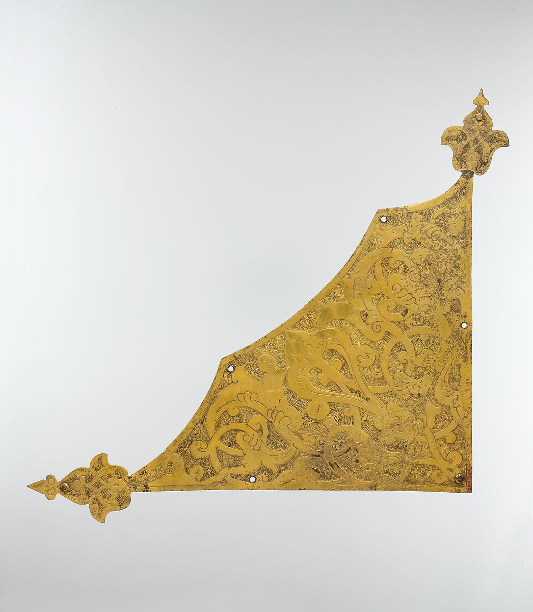This plaque is engraved with a symmetrical arabesque pattern against a ring-punched ground and terminates in two trefoils. It was probably one of a set adorning a large door, as can be seen in examples in the Suleymaniye Mosque and the Topkapi Palace in Istanbul. Three of the seven rivets used for attachment remain.