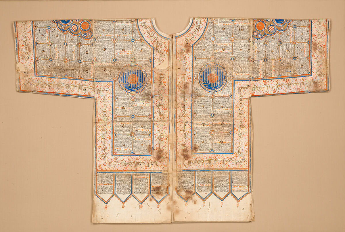 This talismanic shirt was believed to be imbued with protective powers and may have been meant to be worn under armor in battle. Its surface is decorated with painted squares, medallions, and lappet-shaped sections with the entire Qur'an written inside; these areas are bordered by the ninety-nine names of God written in gold against an orange background. A panel at the center of the reverse contains a proclamation in gold script stating, "God is the Merciful, the Compassionate."