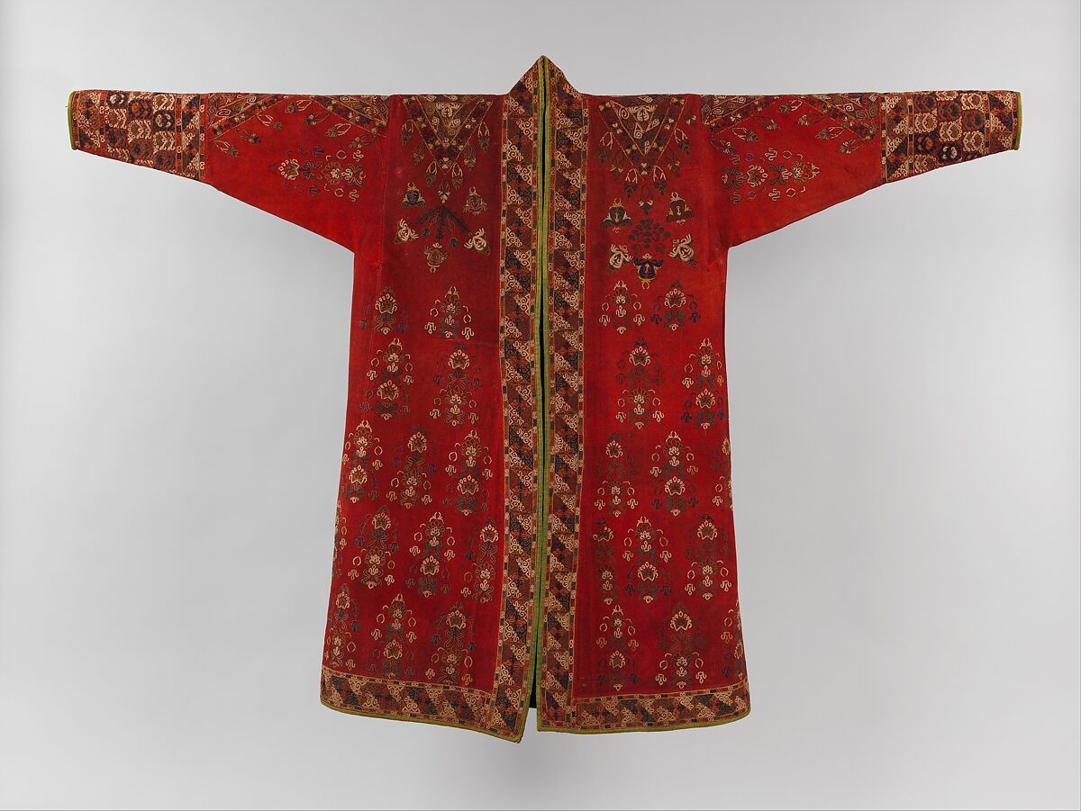 - Medium: Ground fabric: hand-spun red plain-weave wool (warp and weft); embroidery: silk; facing: ikat silk (warp), cotton (weft); lining: roller-printed Russian cotton