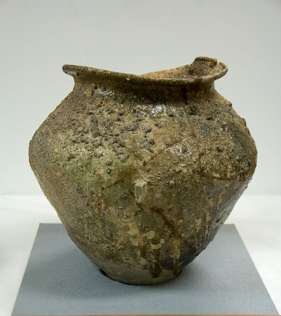 Echizen ware is notable for being fired without applied glazes, and it is often left undecorated. This jar may have toppled during firing, acquiring an uneven blanket of natural ash glaze, along with large cracks and encrustations from neighboring pots. Its relatively narrow foot likely contributed to the kiln accident that produced a long tear from base to rim and distorted the vessel’s overall form. Kiln debris remains fused to the surface, the foot, and even the interior, as seen in the X-ray. The natural ash glaze—rich in fluxes, or oxides that stimulate the liquidation of silica—melted fluidly over the stoneware body, forming rivulets that trace the flow of molten ash. These patterns allow conservators to reconstruct the jar’s orientation in the kiln and the moment of its collapse. .